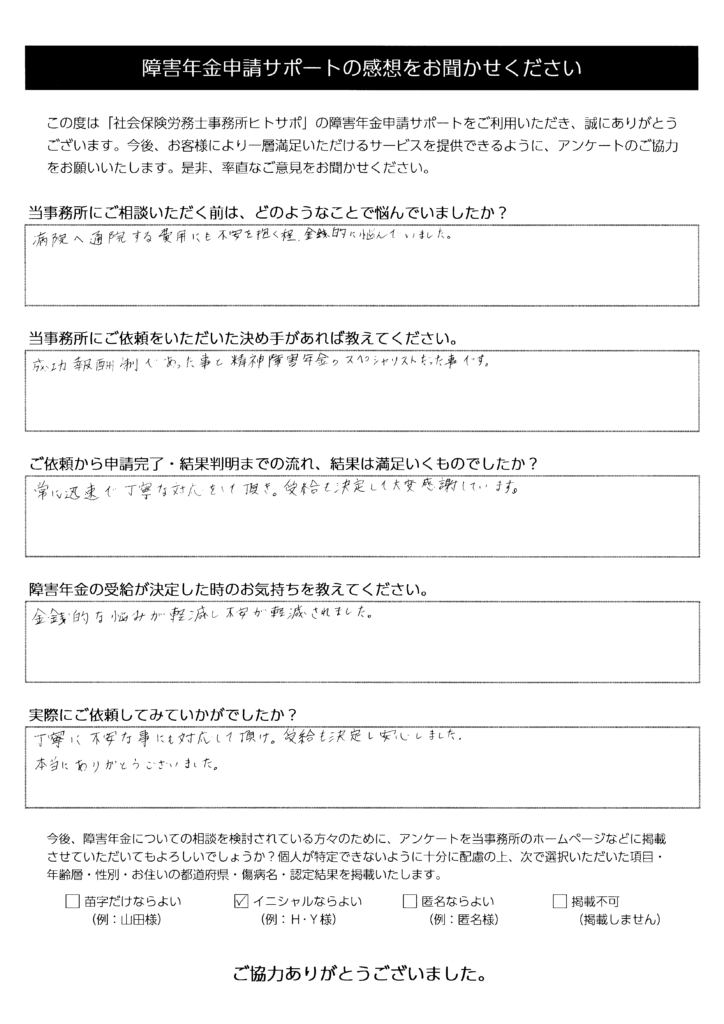 常に迅速で丁寧な対応をしていただき、受給も決定して大変感謝しています。